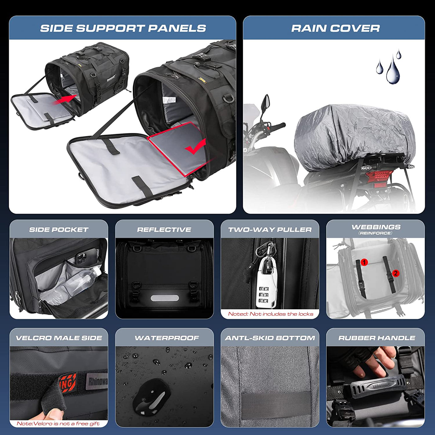 Accessories: Provides a shoulder strap which can be connected to the bag,it can be used as a shoulder bag after removing from the motorcycle; Provides two extended straps to help you secure bulky items outside the bag; Provides four Straps to help you fix the bag on the rack; a rain cover with drawcord is available to protect the motorcycle from rain, even if the wind blows, the rain cover will not be blown off.