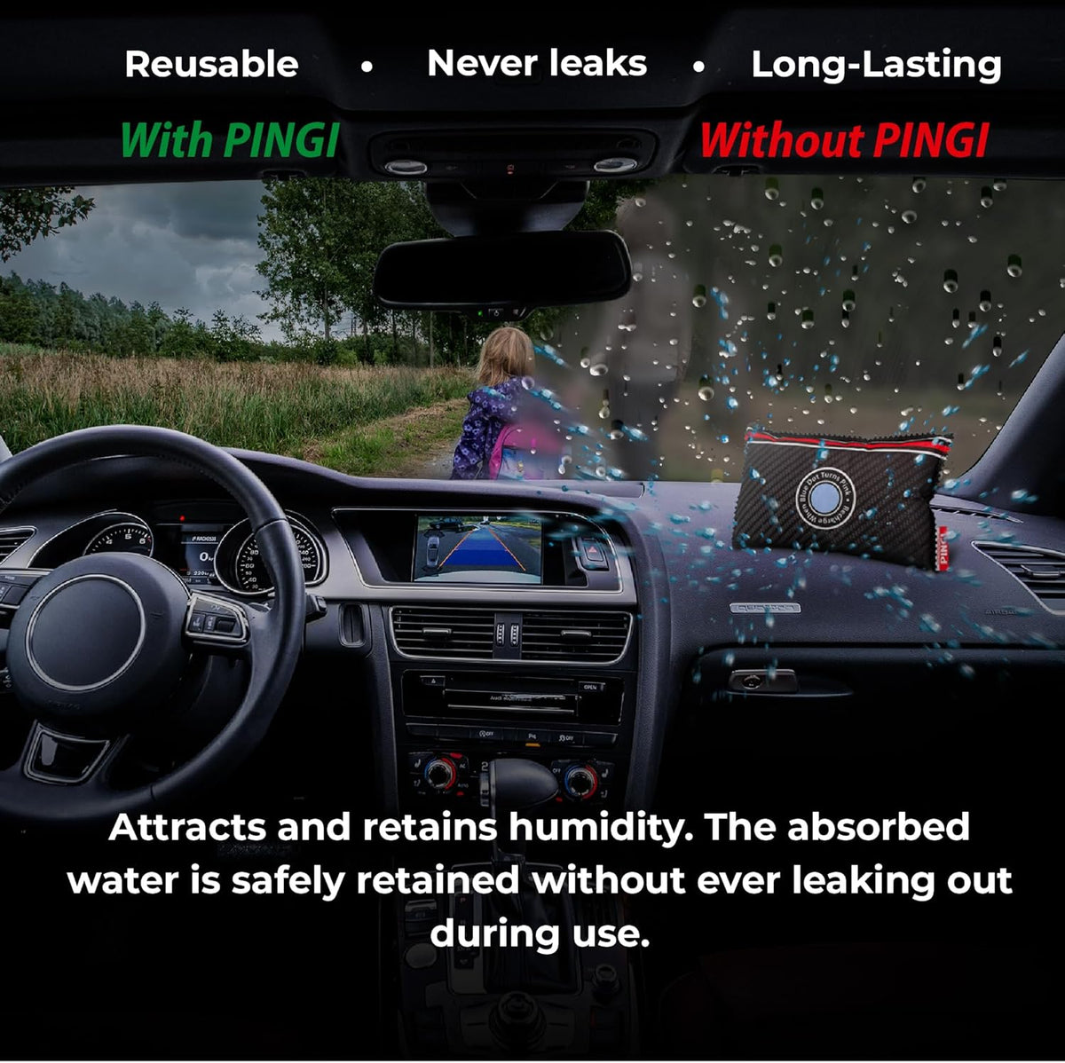 The PINGI Reusable Car Dehumidifier makes driving safer, more comfortable, and more enjoyable — all while saving money and keeping your car looking and smelling its best.